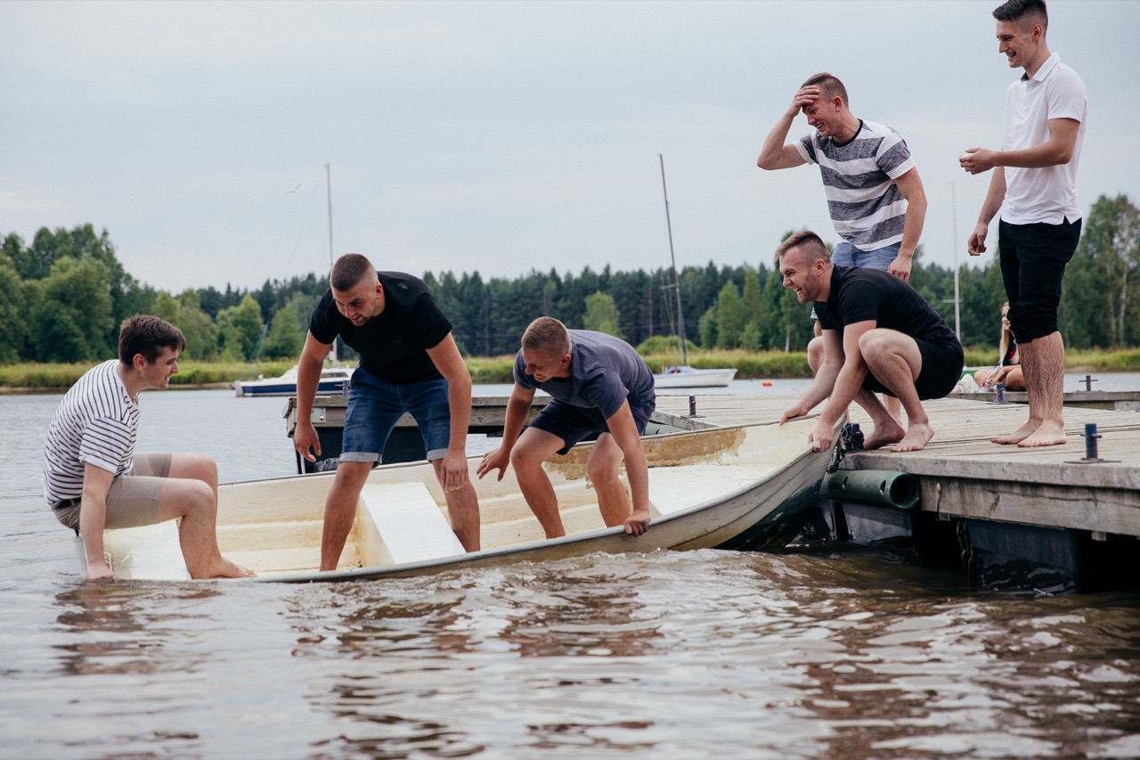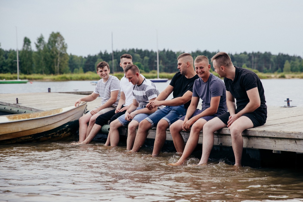 Przygotowania do ich wielkiego dnia rozpoczęły się już dzień wcześniej, kiedy zaczęli się zjeżdżać pierwsi goście weselni. Już wtedy rozpocząłem wykonywać dla niech reportaż, to po prostu trzeba było uwiecznić! Jak to koledzy, którzy nie widzieli się przez dłuższy, czas chcieli Dawida odpowiednio przygotować na dzień następny, więc w pierwszej kolejności należało opić garnitur. Następnie starali się przekonać go do tego, żeby jeszcze przez jakiś czas pozostał kawalerem. Pomimo próby wrzucenia go do ogniska, wrzucenia go do łódki i wypchnięcia na jezioro Dawid nie zmienił zdania, nawet męskie rozmowy nie pomogły. Patrycja wiedziała, co się święci, więc nie patrząc na nic, wybiegła w szlafroku z domu, aby wałkiem do ciasta wybić im wszystkim te dziwne pomysły z głowy. Mała fotorelacja pozwoliła wszystkim się odstresować i zapewniła bardzo dużą dawkę śmiechu.